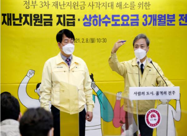 김승수 전주시장과 강동화 전주시의회 의장은 8일 시청 4층 회의실에서 기자회견을 열어 코로나19로 피해를 입은 소상공인들의 경제 안정을 돕고 정부 3차 재난지원금의 사각지대를 해소하기 위해 7개 분야, 총 152억3000만 원 규모의 지원을 골자로 한 ‘전주형 3차 재난지원금’을 지급한다고 밝혔다.