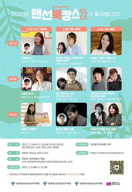 ‘랜선 북캉스2’는 그림책, 문학, 미술, 영화, 뮤지컬 작가 9명과 함께 하는 실시간 온라인 북토크로 △랜선으로 떠나는 그림책여행(2월 24일) △랜선으로 떠나는 문학여행(2월 25일) △랜선으로 떠나는 예술여행(2월 26일)의 주제로 3일간 운영한다.