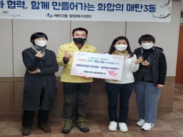 이번 기탁이 관내 어려움을 겪고 있는 저소득층 분들에게 작은 위로가 되었으면 좋겠다. 앞으로도 이웃과 행복을 나누는 따뜻한 매탄3동이 되도록 지속적인 후원과 관심 부탁드린다”고 말했다.