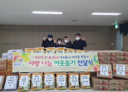 이번 전달식에서 동 유관 단체장과 관내 각계각층의 자발적인 참여로 기부 받은 백미 1,480kg(10kg 148포)와 라면 80박스(2500봉)를 홀몸어르신과 조손가족 등 저소득 가정 366세대에 전했다.