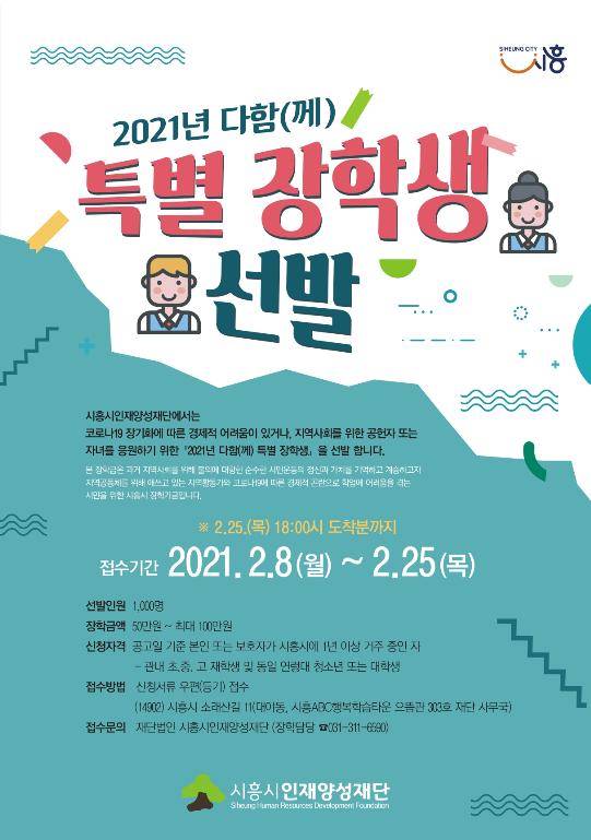 (재)시흥시인재양성재단(이사장 임병택)이 코로나19 장기화로 경제적 어려움을 겪고 있는 시흥시민을 응원하기 위해 8일부터 ‘다함(께) 특별 장학생’ 1,000명을 선발 모집한다.