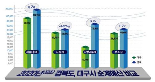 대구시와 경상북도의 재정을 세목별로 비교해 보면 지방세 수입은 각각 3조 5,793억원과 4조 3,870억원으로 8,077억원, 지방교부세는 1조 2,748억원과 7조 2,307억원으로 5조 9,559억원, 국비보조금은 2조 8,634억원과 4조 8,680억원으로 2조 46억원이 경북이 더 많다.