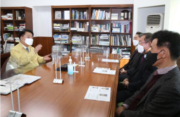 [한국연예축제일보, 안성경기자] 한범덕 청주시장이 8일 집무실에서 산업단지 이사장들을 만나 기업발 코로나19 n차 감염의 선제적 대응과 기업의 방역수칙 준수를 부탁했다.