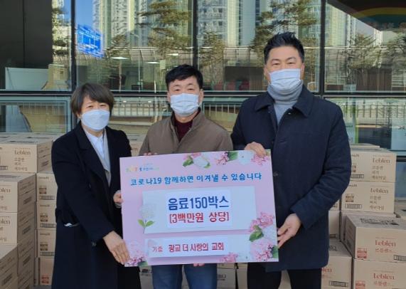 [한국연예축제일보, 허난세기자] 수원시 영통구에 위치한 광교 더사랑의교회(담임목사 이인호)에서 8일, 코로나19 방역과 설 연휴 24시간 종합대책반 운영 등으로 고생하는 수원시 공직자들을 위해 음료 150박스(3백만원 상당)를 기부했다.
