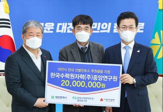한국수력원자력(주) 중앙연구원(원장 김한곤))은 8일오후, 장기화된 코로나-19 방역에 지친 의료진을 위해 사용해 달라며, KF94마스크, VTM 배지, 컵라면, 생수, 쵸코바 등 위문품(2,000만원 상당)을 대전시에 지정 기탁했다.
