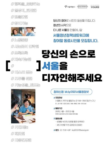 [한국연예축제일보, 안성경기자] 서울시는 코로나19와 같은 예측 불가능한 재난, 성평등, 불평등 심화 등 다양한 문제를 함께 고민하고, 청년당사자의 시각으로 다각적인 사회적 해법을 모색하기 위하여 서울청년정책네트워크 멤버를 모집한다.
