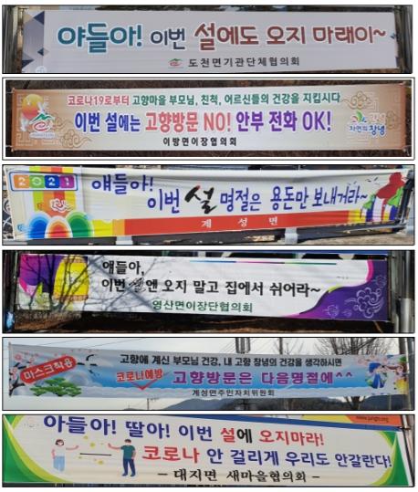 특히, ‘야들아! 이번 설에도 오지마래이~(도천면기관단체협의회)’, ‘이번 설에는 고향방문 NO!, 안부 전화 OK!(이방면이장협의회)’, ‘얘들아! 이번 설 명절은 용돈만 보내거라~(계성면)’등 읍·면 각종 기관·사회단체에서는 특색 있고 참신한 문구를 활용한 현수막들을 게첩하면서 ‘설 명절 마음만 고향 방문하기 캠페인’의 분위기를 더욱 고취시키고 있다.