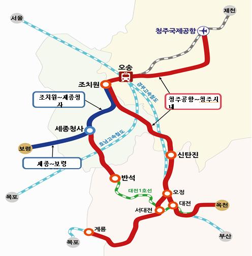 한편, 충북도 각계에서 충청권 광역철도망 청주도심 통과 노선의 반영을 정부에 요구하고 있으며, 국토부는 현재 막바지 작업이 진행 중인 것으로 알려졌다.