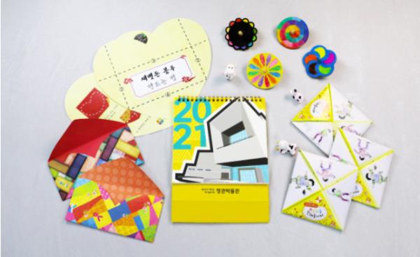 교육재료는 총 4가지로, ‘아기새 소리’가 담긴 유물 카드를 완성한 관람객에게는 ▲신축년 새해 달력을 제공하고 ‘소 인형’의 경우는 ▲세뱃돈 봉투(2월 11일) ▲손팽이(2월 12일) ▲딱지(2월 13일) 등 전통놀이 만들기 도구를 제공한다. 만들기 방법은 정관박물관 누리집에 게재될 예정이며, 각 가정에서 이를 내려받아 비대면으로 자율체험 교육을 진행하면 된다.