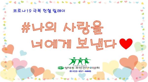[한국연예축제일보, 유혜경기자] 강릉시 성덕동주민건강위원회는 코로나19로 인한 혈액 수급부족을 해소하는데 시민들의 마음을 전달하고자 강릉시민 모두가 참여할 수 있는 ‘사랑의 헌혈 릴레이 챌린지’를 진행 중이다.