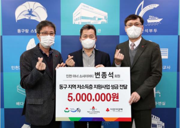[한국연예축제일보, 유혜경기자] 인천광역시 동구는 산업 안전관리 대행업체인 ㈜세이프티컨설팅의 변종석 이사가 이웃사랑 성금 500만 원을 기탁해 왔다고 9일 밝혔다.