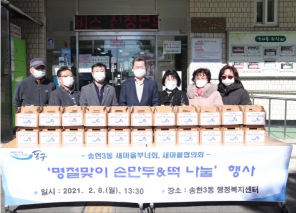 [한국연예축제일보, 유혜경기자] 인천광역시 동구 송현3동 새마을회는 지난 8일 관내 취약계층 이웃들에게 새마을부녀회ㆍ협의회원이 직접 빚은 만두와 떡국떡 50인분을 전달했다.