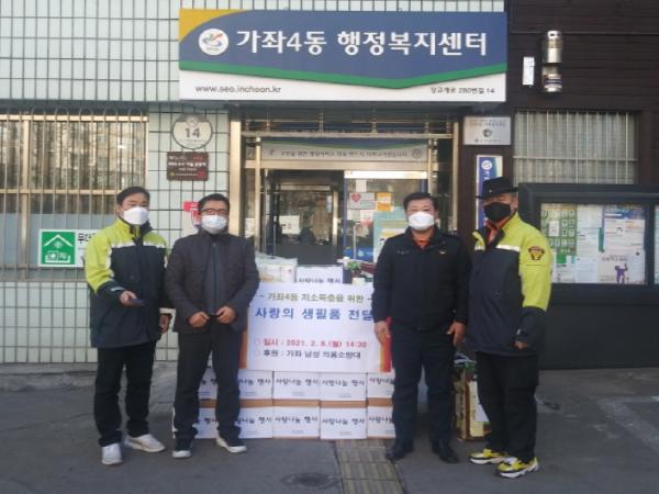 [한국연예축제일보, 유혜경기자] 인천광역시 서구 가좌 남성의용소방대 일동은 지난 8일 라면, 쌀, 휴지 등 설맞이 생필품을 가좌4동 저소득가정 5세대에 전달했다.