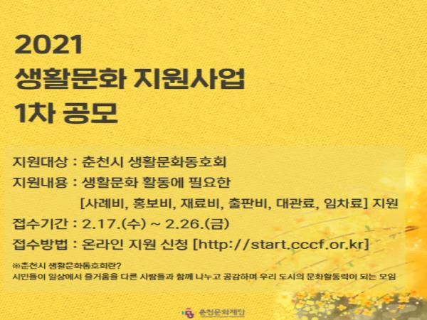 [한국연예축제일보, 이순례기자] 춘천문화재단은 시민들의 일상에서의 문화 활동 기반 마련을 위해 춘천시 생활문화동호회 대상으로 2월 17일부터 26일까지 2021년 생활문화 지원사업 1차 공모를 진행한다.