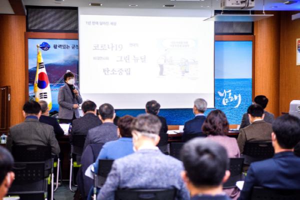 8일(둘째주) 열린 간부회의는 ‘차이나는 남해 클라스’라는 부제로 특강이 진행됐다. 이날 특강 제목은 ?년 국내외 기후위기 대응, 탄소중립 전망과 과제’였으며, ‘국무총리 그린뉴딜 특별보좌관’등으로 활동하고 있는 녹색전환연구소 이유진 연구원이 강사로 나섰다. 향후 그린 뉴딜 정책의 추진 방향과 그 당위성에 대한 내용이 주를 이뤘다.