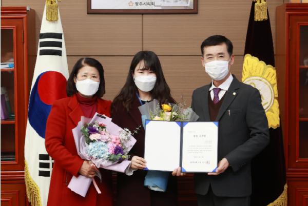 [한국연예축제일보, 허난세기자] 광주시의회는 지난 8일, 2월의 칭찬릴레이 칭찬 공무원으로 농업정책과의 이미소 주무관(지방농업서기)을 선정, 의장실에서 증서를 수여했다.