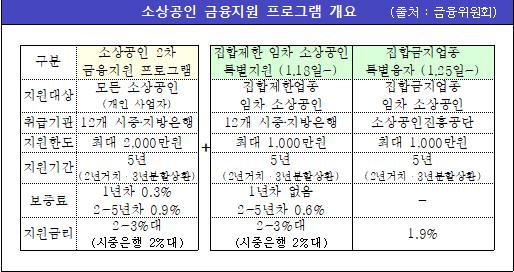 소상공인 금융지원 프로그램으로는 모든 소상공인에게 최대 2,000만 원을 지원하는 ‘소상공인 2차 금융지원 프로그램’ 외에도 ‘집합제한 특별대출’ 및 ‘집합금지업종 특별융자’ 금융지원 프로그램이 있다.
