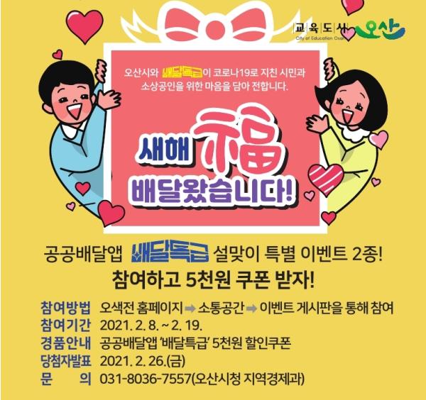 [한국연예축제일보, 안성경기자] 오산시는 장기화된 코로나19로 움츠러든 지역경제에 활력을 불어 넣기 위해 공공배달앱 「배달특급」 설맞이 특별이벤트 ‘새해 福 배달왔습니다!’를 실시한다.