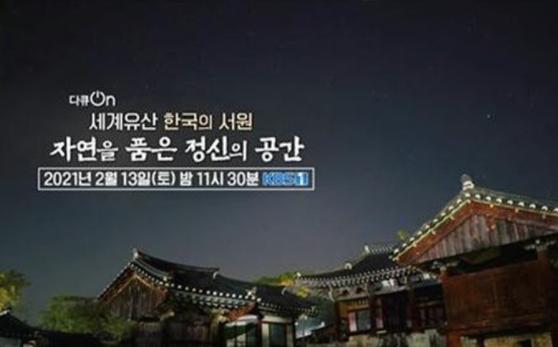 [한국연예축제일보, 이순례기자] 문화재청은 2019년에 유네스코 세계유산에 등재된 '한국의 서원'을 조명하는 다큐멘터리 '세계유산 한국의 서원자연을 품은 정신의 공간'을 다가오는 설 다음날인 13일 토요일 오후 11시 30분에 한국방송공사(KBS) 1TV '다큐 On(온)'에서 방송한다고 밝혔다.?