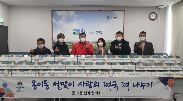 [한국연예축제일보, 유혜경기자] 평택시 용이동 6개 단체협의회(주민자치위원회, 통장협의회, 바르게살기위원회, 체육회, 청소년지도위원회, 지역사회보장협의체)는 지난 9일 다가오는 설 명절을 맞아 떡국 떡(200만원 상당)을 지역 내 저소득 취약계층 100가구에 전달하는 ‘사랑의 떡국 떡 나눔’행사를 가졌다.