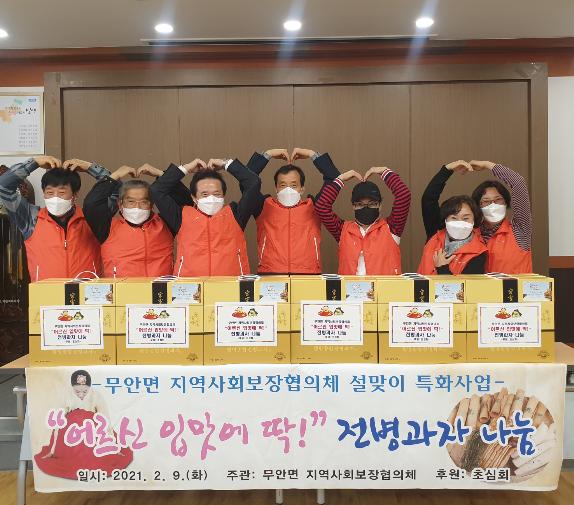 [한국연예축제일보, 유혜경기자] 무안면 지역사회보장협의체는 9일 설 명절을 맞이해 ‘어르신들 입맛에 딱 맞는’ 사랑의 전병과자를 저소득 소외계층 어르신 60세대에게 마스크 착용 등 철저한 방역조치 속에서 안전하게 전달했다.