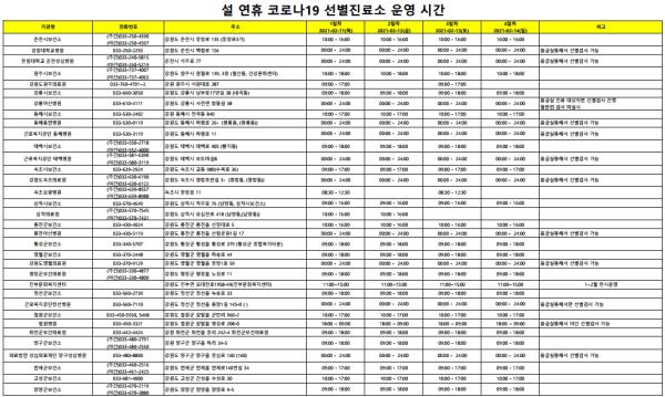 [한국연예축제일보, 한진우기자] 강원도는 설 연휴기간(2021.2.11~2.14.)중 도민의 의료기관 및 약국 이용 불편을 최소화하고 응급환자 진료 및 다수 인명피해 발생에 대비하여 「설 연휴 응급진료체계」를 가동한다. 아울러, 코로나19 진단검사 공백 방지를 위해 설 연휴 선별진료소를 운영한다.