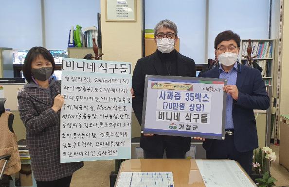 [한국연예축제일보, 유혜경기자] 거창군은 아프리카 TV(온라인 채널), BJ비니가 운영하는 음악방송 회원 모임인 비니네 식구들에서 설 명절을 앞두고 9일 관내 어려운 아동들을 위해 사과즙 35박스(70만원 상당)를 기부했다고 9일 밝혔다.