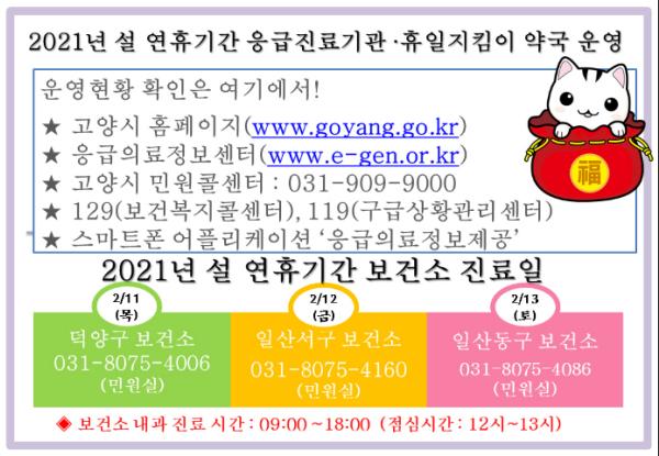 또한 설 연휴기간 중에는, 보건소와 고양시민원콜센터, 구급상황관리센터, 129보건복지콜센터를 통해 문 여는 의료기관 및 약국 운영 여부와 구급차 출동, 코로나19 선별진료소 등에 대한 신속한 안내를 받을 수 있다.
