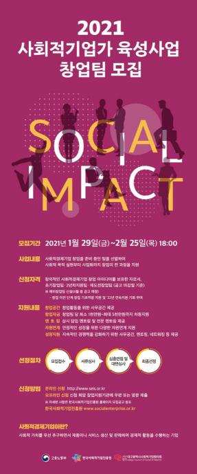 사회적기업가 육성사업은 혁신적인 아이디어를 가지고 사회적 문제를 해결하는 사회적기업가를 발굴·육성하기 위해 사회적기업 창업의 전 과정을 지원하는 사업이다.