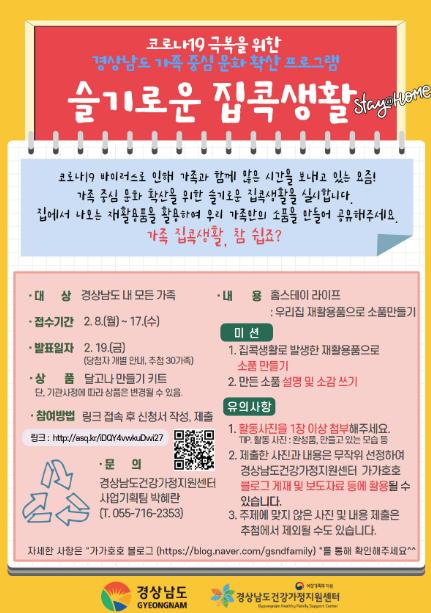 [한국연예축제일보, 이순례기자] 경상남도와 경상남도 건강가정지원센터는 코로나19 확산으로 외부활동을 자제하는 시기, 가정에서 가족들과 함께 행복한 시간을 보낼 수 있도록 ‘슬기로운 집콕 생활’ 캠페인을 지난해에 이어 올해에도 추진한다고 밝혔다.