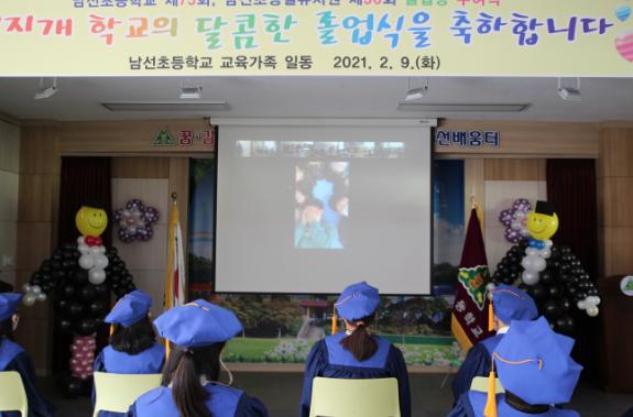 남선초등학교(교장 박근숙)는 2021년 2월 9일(화) 09:40 온라인 스튜디오를 통해 ‘숲속 무지개 학교의 달콤한 졸업식’을 주제로 초등 제75회, 병설유치원 제36회 졸업식을 합동으로 진행하였다. 접촉을 최소화하여‘온라인 스튜디오를 활용한 비대면 졸업식’,‘달콤한 졸업식 추억만들기’를 실현한 이번 행사는 6학년 11명, 유치원(만 5세) 7명이 주인공이 되어 첨단기술과 아날로그 감성을 접목하여, 안전하고 의미 있는 졸업식이라는 시대의 요구를 반영하여 진행하였다.