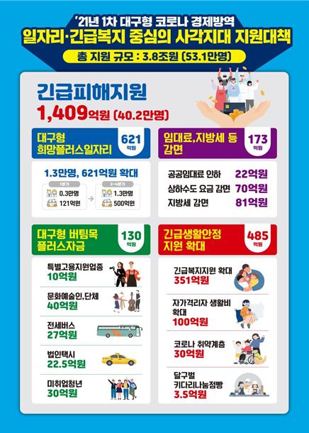 기본방향별로 주요내용을 살펴보면, 우선, 긴급 피해지원 확대를 위해 ▲대구형 희망플러스 일자리 1만개 추가공급, ▲정부지원 사각지대 보완을 위한 버팀목 플러스자금 130억원 지원, ▲소상공인 부담완화를 위한 임대료 인하 및 지방세 감면 173억원, ▲위기가구 2만6천가구 추가지원 등 총 1,409억원 규모을 지원을 추진한다.