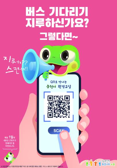 무선 인터넷(WiFi)이 설치된 수원시청·성균관대역 주변 버스정류장 등에서 프로그램을 운영 중이다. 스마트폰으로 버스정류장에 부착된 홍보물(QR코드)을 스캔하면 ‘QR코드로 만나는 수원이 환경교실’ 네이버 블로그로 연결된다.