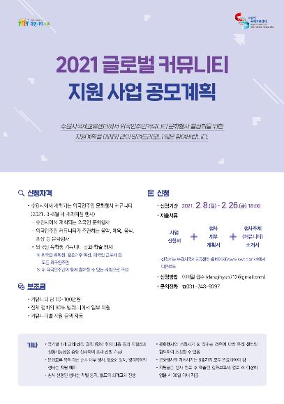 [한국연예축제일보, 유혜경기자] 수원시국제교류센터가 26일까지 ‘2021 글로벌 커뮤니티 지원 사업’에 참여할 모임·단체를 모집한다.