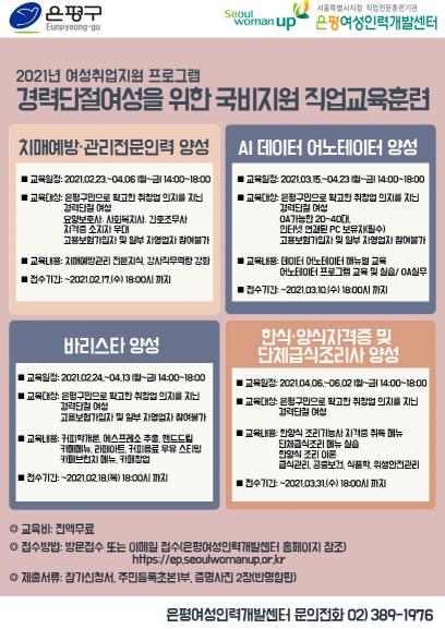 교육 전 과정은 은평여성인력개발센터와의 협업을 통해 진행되며, 체계적인 교육 시스템 운영 및 네트워크 구축기관으로의 취업 연계 등을 제공할 예정이다.