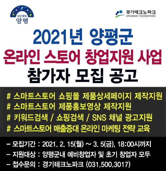 [한국연예축제일보, 유혜경기자] 양평군에서는 관내 중·소상공인 기업 중 성장잠재력이 높은 20개의 기업을 선발해 온라인 마케팅 교육 및 맞춤형 컨설팅 지원 등 온라인 스토어 창업을 위한 지원을 추진한다.