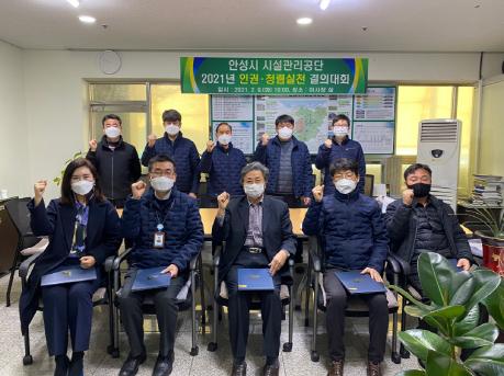 [한국연예축제일보, 유혜경기자] 안성시시설관리공단은 공단의 모든 이해관계자에 대한 인권존중 및 청렴문화 확산을 위해 지난 9일 이사장실에서 팀장급 이상 경영진을 대상으로 ‘2021년 인권·청렴실천 결의대회’를 개최했다고 밝혔다.