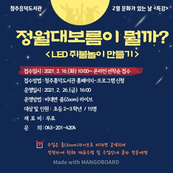 2월에는 정월대보름을 맞아 초등 2~3학년 15명을 대상으로 ‘정월대보름이 뭘까?’라는 주제로 기념일에 대해 알아보고 LED 쥐불놀이 만들기 등 흥미로운 활동을 통해 특강을 운영할 예정이다.
