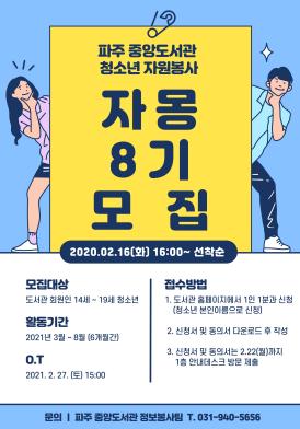 [한국연예축제일보, 유혜경기자] 파주중앙도서관이 청소년들의 꿈과 끼를 다양한 활동으로 펼칠 수 있는 청소년 자원봉사동아리 ‘자몽’ 8기를 오는 16일 오후 4시부터 파주시도서관 홈페이지를 통해 모집한다.