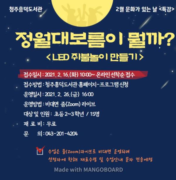 2월에는 정월대보름을 맞아 초등 2~3학년 15명을 대상으로 ‘정월대보름이 뭘까?’라는 주제로 기념일에 대해 알아보고 LED 쥐불놀이 만들기 등 흥미로운 활동을 통해 특강을 운영할 예정이다.