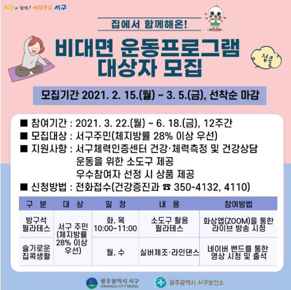 [한국연예축제일보, 유혜경기자] 광주 서구가 코로나19 장기화로 신체활동이 부족한 지역주민의 건강증진과 우울감 해소를 위해 비대면 운동프로그램을 운영한다.