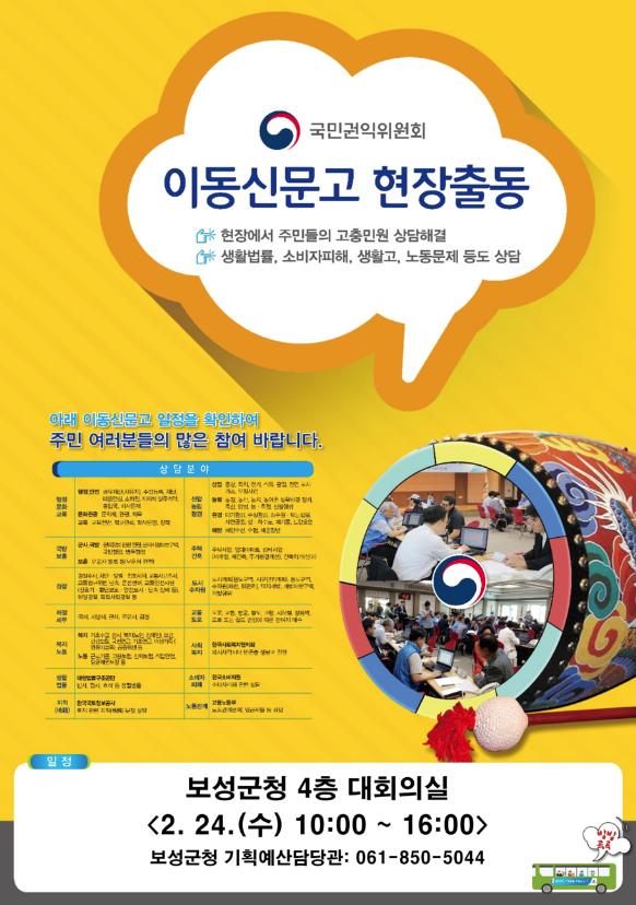 [한국연예축제일보, 유혜경기자] 보성군은 국민권익위원회 주관으로 오는 24일 오전 10시부터 오후 4시까지 보성군청 4층 대회의실에서 이동신문고를 운영한다.