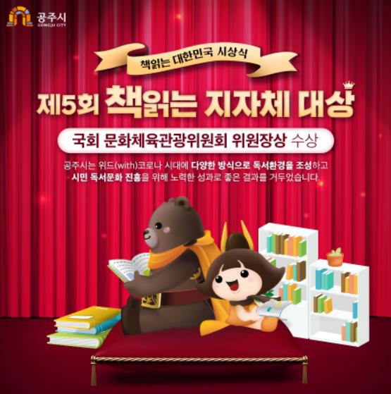 [한국연예축제일보, 이순례기자] 공주시가 (사)국민독서문화진흥회가 주관하고 국회 문화체육관광위원회가 후원한 ‘제5회 대한민국 책 읽는 지자체’ 영예 대상을 수상했다고 10일 밝혔다.