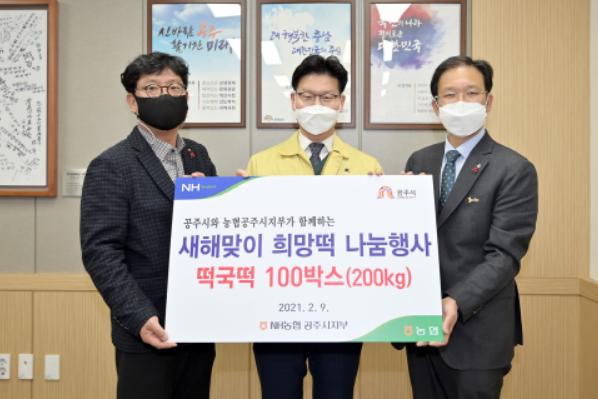 우선, NH농협 공주시지부는 지난 9일 관내 저소득계층에게 작은 도움이 되길 바란다며 떡국 떡(2kg) 100박스(120만원 상당)를 전달했다.