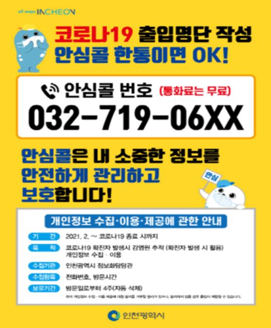 안심콜 출입관리서비스는 수기명부 작성으로 인한 개인정보 유출이 사회적 문제로 부각되고 있고, QR코드 사용에 어려움을 느끼는 디지털 취약계층을 위해 기존 출입관리 방식을 개선한 서비스다. 통화료는 발신자(시민)와 수신자(인천시) 모두 무료다.