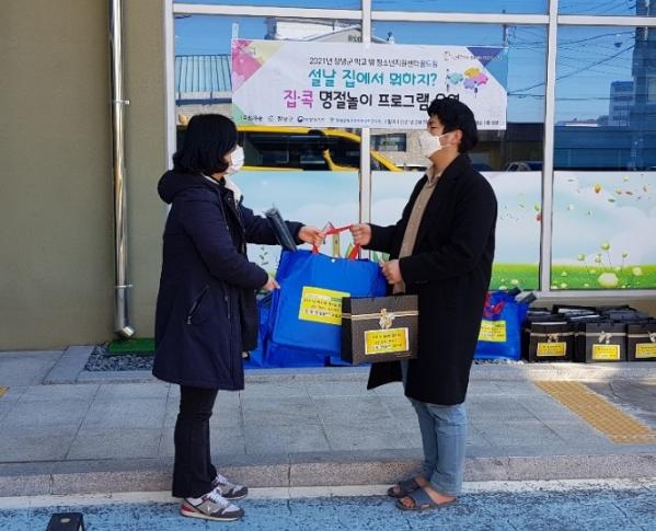 이번 프로그램은 학교 밖 청소년 지원센터 꿈드림에서 학교 밖 청소년 15명을 대상으로 설날 가정에서 가족들과 함께 할 수 있는 정서지원키트(윷놀이, 명화그리기)와 떡국, 전, 식혜, 과일 등으로 구성된 설 명절 음식 세트를 제공했다.