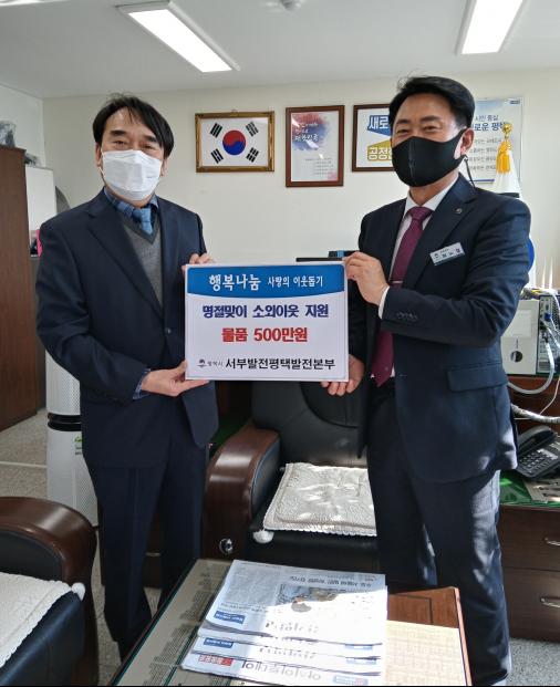 [한국연예축제일보, 유혜경기자] 평택시 포승읍 소재 서부발전평택발전본부에서는 설 명절을 앞두고 코로나19 위기극복과 다함께 행복한 명절을 위해 지난 8일 소외된 이웃 25여 가구에 온누리카드(500만원)를 전달했다.