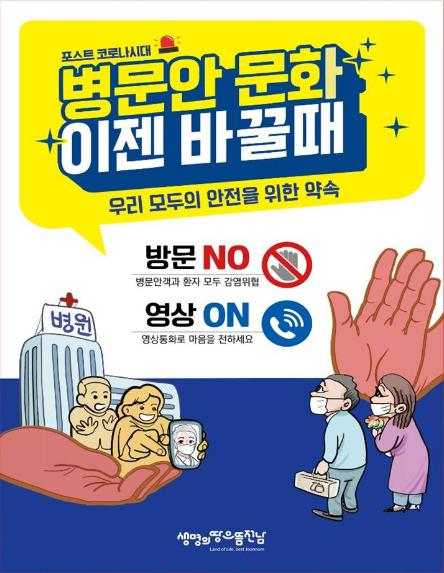 곽준길 전라남도 식품의약과장은 “설 연휴 기간 의료기관을 통한 코로나19 감염 차단을 위해 ‘병문안 멈춤’으로 도민의 안전과 의료기관 방역에 최선을 다하겠다”며 “포스트 코로나 시대를 대비해 병문안 문화가 방문 대신 영상면회로 바꿀 수 있도록 개선하겠다”고 말했다.