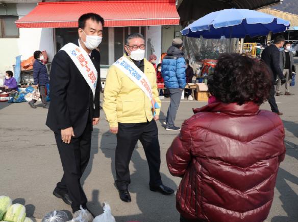 김명선 의장과 방한일 의원(예산1)은 10일 예산 전통시장을 방문해 방역상황을 점검하고 상인회와 간담회를 통해 애로사항을 청취했다.