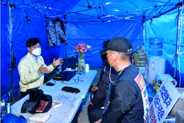 이 날 변 시장은 현장에서 노동자들을 만나 그 간의 진행과정과 현재 상황 등에 대한 의견을 공유했다. 이어 하루 빨리 노동자들이 일상으로 돌아갈 수 있도록 최선을 다할 것이라며 설 명절을 차디찬 밖에서 보내야 하는 안타까움을 위로했다.